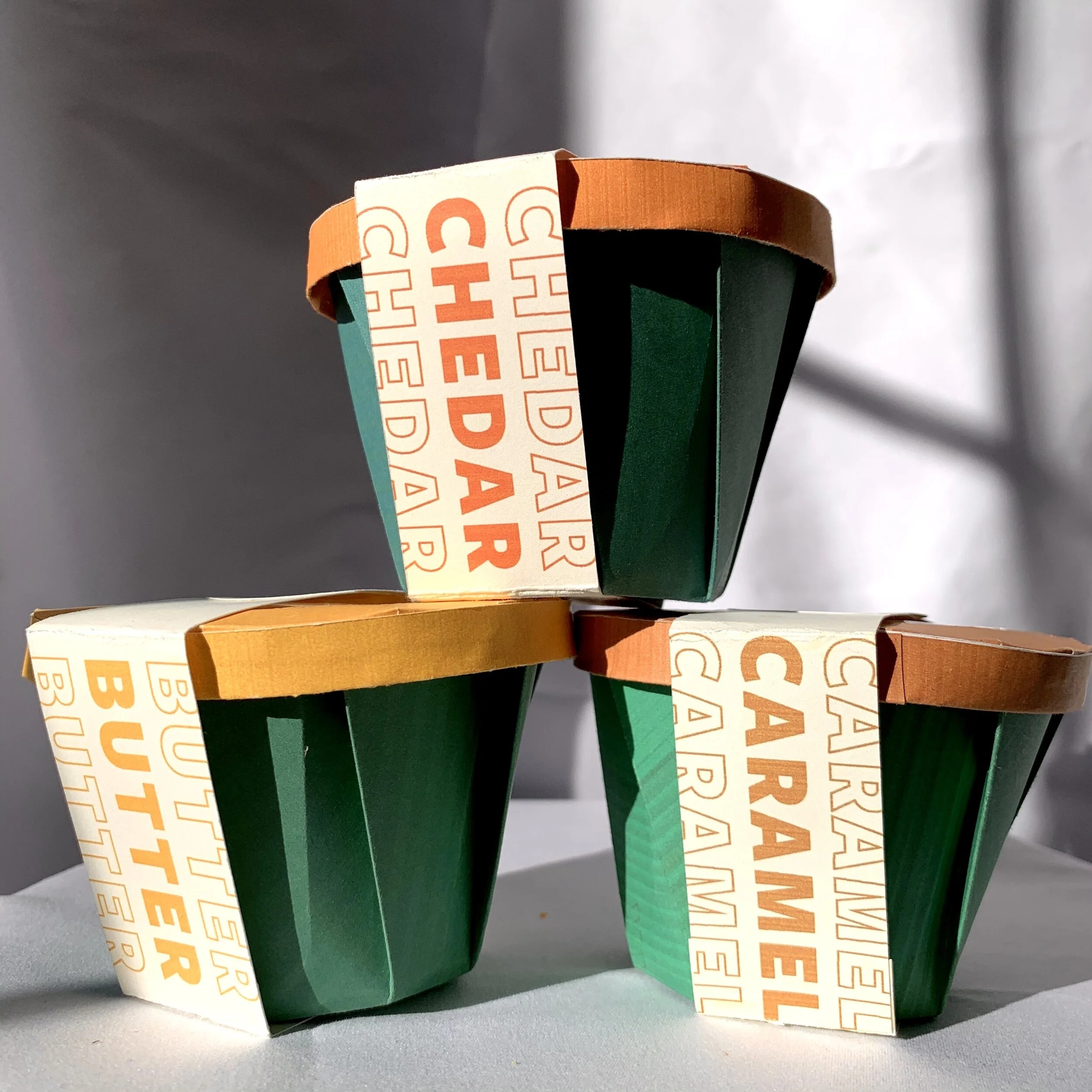 Petal Pop is a package design that allows you to easily share popcorn with your loved ones. Petal pop was originally inspired by the thought of giving someone a flower. At the bottom of the containers are sweet messages that can be read once the popcorn is finished to add a little happiness to the receiver’s day.